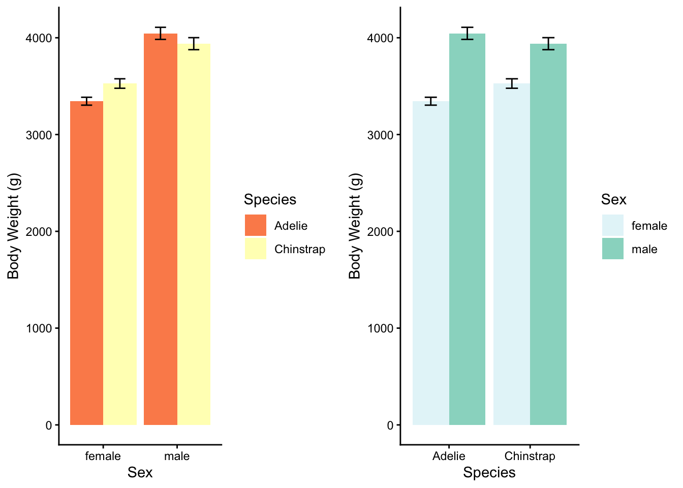 The interaction, explained: Adelie males are heavier than Chinstrap males, but Adelie females are not as heavy as Chinstrap females. But the species are roughly similar in weight.