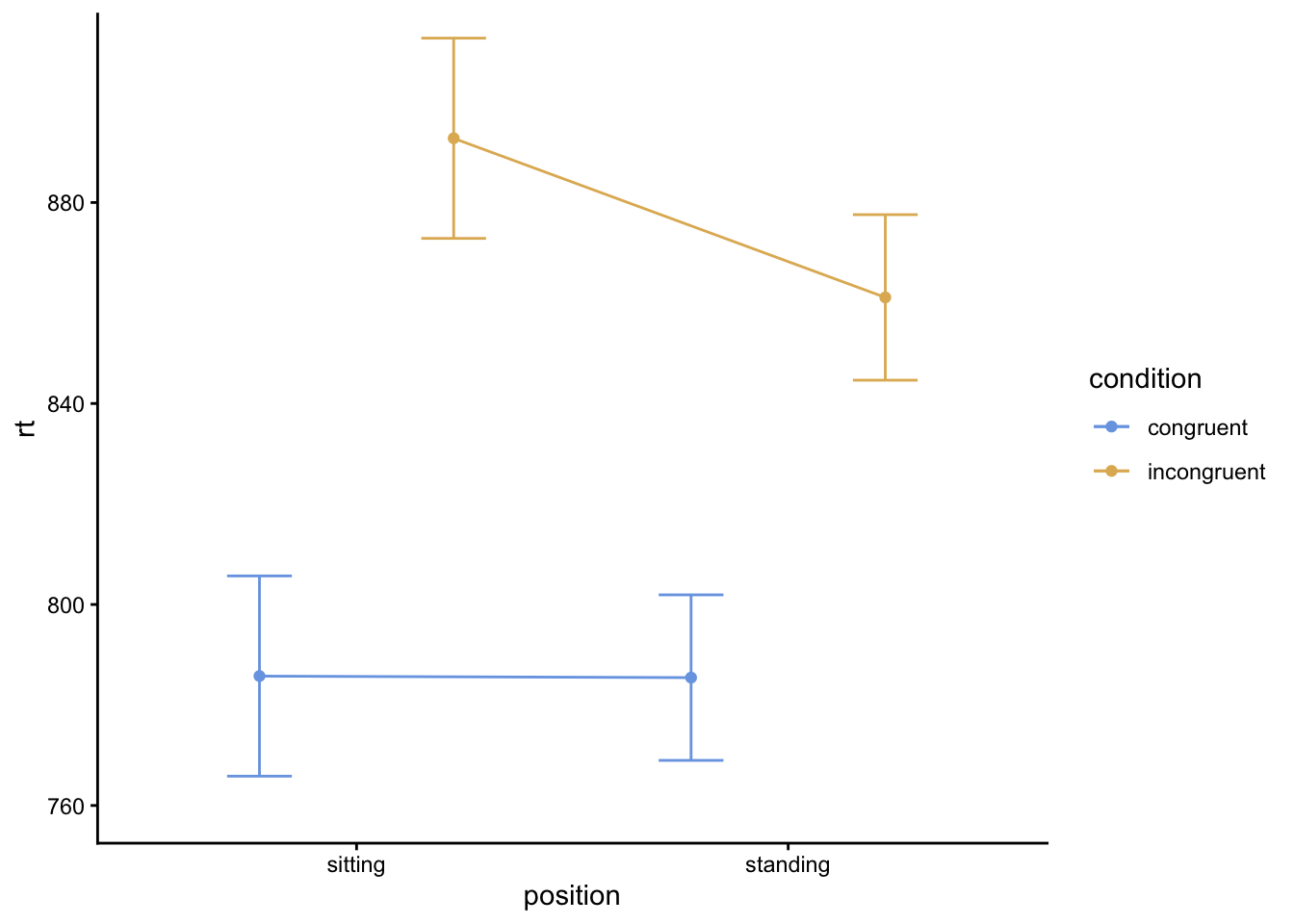 There’s no effect of position, though, \(F(1, 64)=0.75,p=.39\); participants didn’t respond more slowly when sitting or standing.